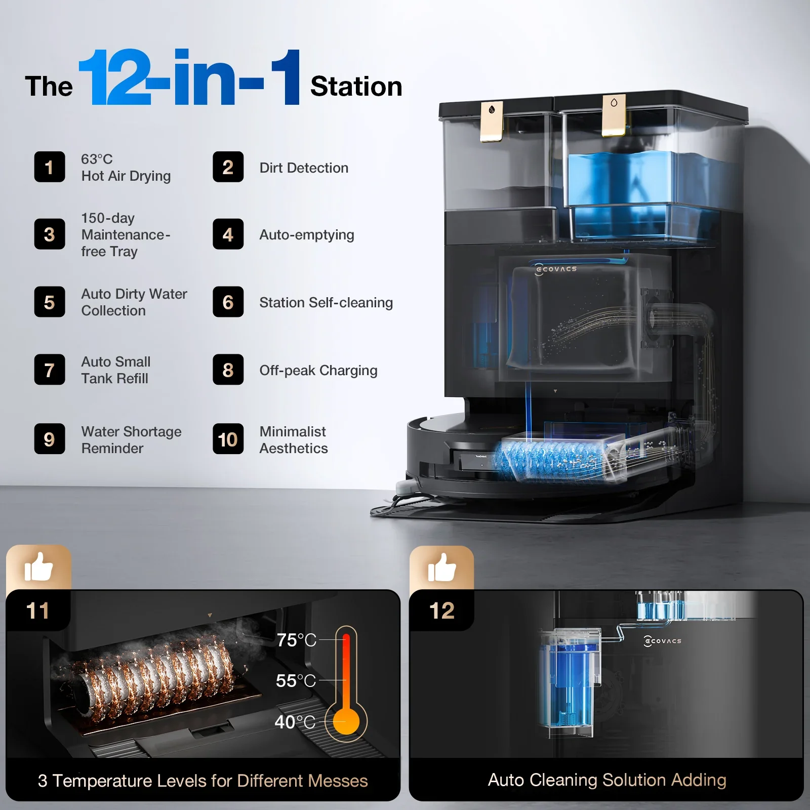 Der DEEBOT X8 PRO OMNI verbindet leistungsstarkes Saugen mit einem OZMO ROLLER Wischsystem samt kontinuierlicher Frischwasserzufuhr. Die OMNI Basisstation übernimmt zentrale Pflegeaufgaben: von Heißwasserreinigung der Wischwalze über Heißlufttrocknung bei 63 °C bis zur automatischen Reinigungsmittel-Dosierung. So werden selbst hartnäckige Flecken effizient gelöst, während der Roboter systematisch navigiert und verschiedene Bodenarten zuverlässig bearbeitet.